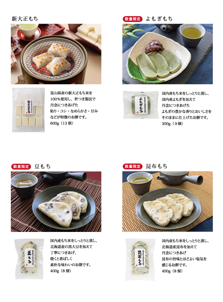 富山県産の新大正もち米を100%使用し、杵つき製法でつきあげた、粘り・コシ・なめらかさ・甘い風味などが特徴のおもちです。