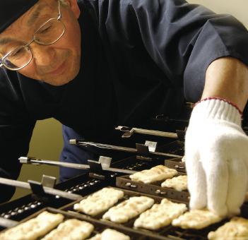 昔ながらの技法と心を大切に守りながら、もち米ならではの自然のおいしさ(生地の甘さと香り・舌触り・歯ごたえ・食べた時の音・焼き色・形状)にこだわり焼匠が心を込めて、丹念に焼き上げます。